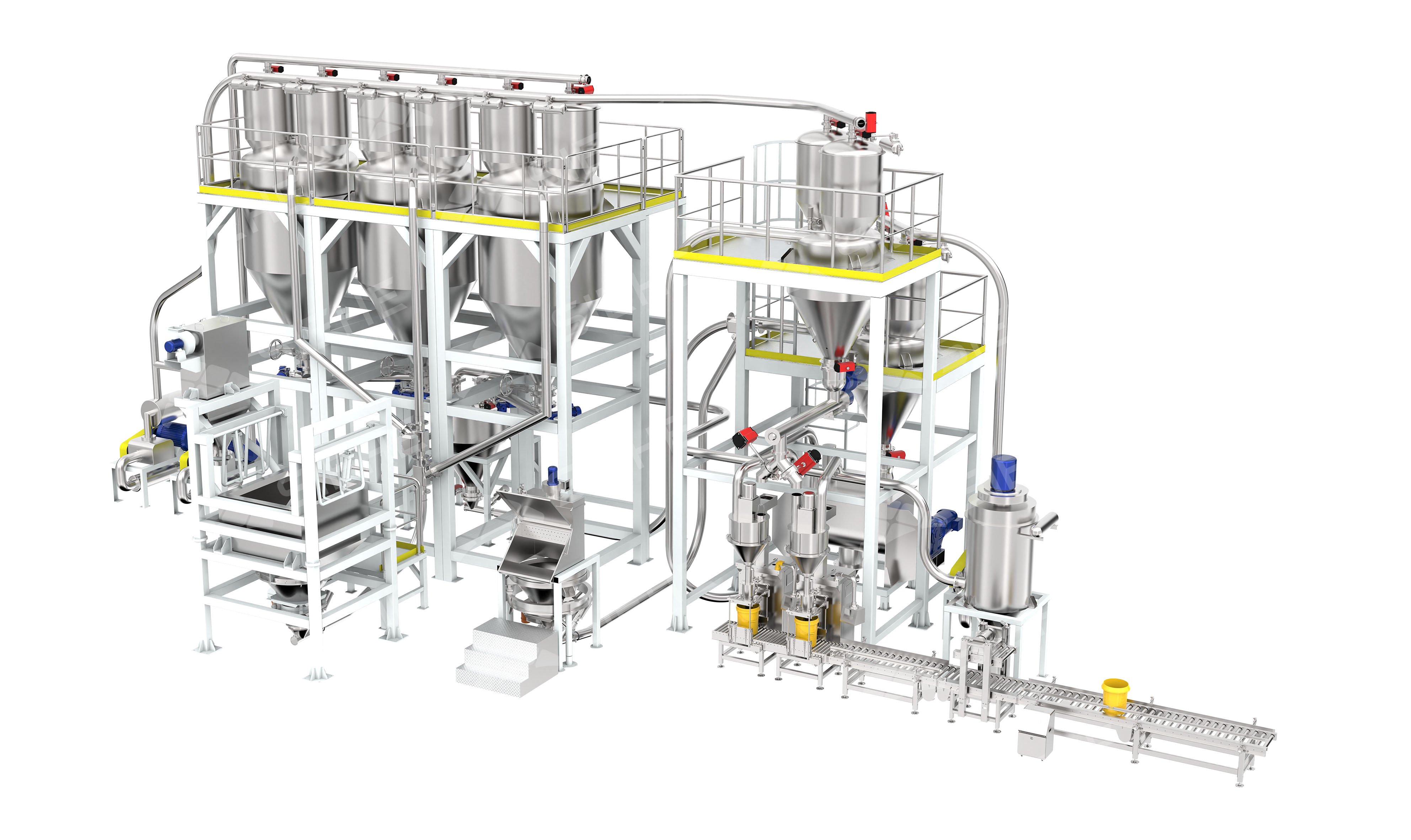 大袋粉体原料采用负压稀相输送方式,撬块式设计原料储存和全自动配料系统,全程密闭输送,保障生产环境洁净。针对客户厂房高度限制,设备总高需低于8米,创新采用气粉分离与储料仓一体式结构,有效控制撬块高度,并采取连续进料设计,保障产能。储料仓配置雷达料位计和固定式料位计,双重安全保障、实时监控料位。系统采用伺服控制及梅特勒-托利多高精度模块,可自行按单号、配方执行自动配料,精度可达5‰。配料完成后气力输送至缓冲仓等待混合。
